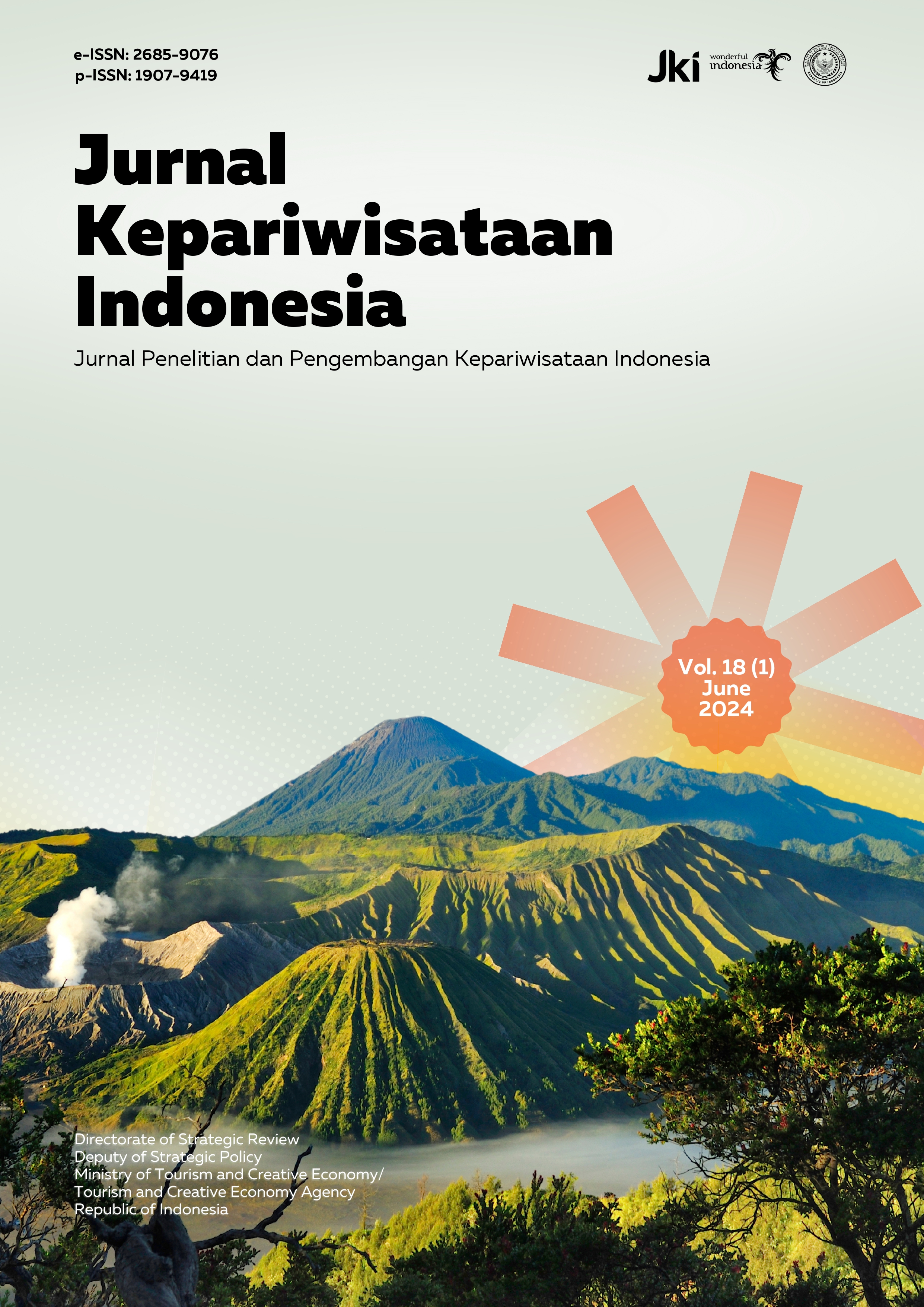 The Jurnal Kepariwisataan Indonesia: Jurnal Penelitian dan Pengembangan Kepariwisataan Indonesia Vol. 18 No. 1 (2024) officially implements the new copyright policy, as previously announced in the official announcement. Under this policy, authors retain copyright to their works while granting the journal the right of first publication with a Creative Commons Attribution License. This license allows the authorsβ work to be shared and used by others with proper acknowledgment of the authorship and the journal's initial publication, while also enabling authors to distribute their work non-exclusively through institutional repositories or other platforms. This new policy reflects our commitment to open access and broader academic collaboration.